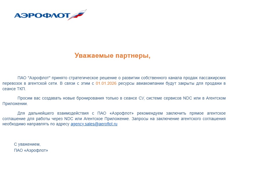 ПАО «Аэрофлот» уведомило туроператоров и агентства о принятии стратегического решения по развитию собственных каналов продаж в агентской сети. С 1 января 2026 года продажа авиабилетов авиакомпании будет прекращена в сеансе ТКП. Новые бронирования предполагается оформлять в сеансе СУ («Система Управления»), через сервисы NDC (New Distribution Capability) или Агентское Приложение.