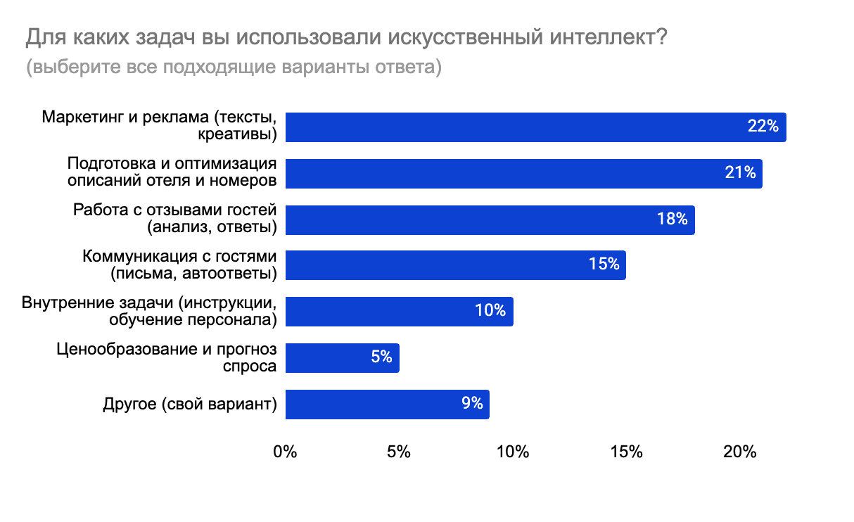 Чаще всего ИИ применяют для подготовки рекламных материалов, текстов и креативов – этот вариант выбрали 22% респондентов. Почти столько же участников (21%) используют технологии для подготовки и оптимизации описаний отелей и номеров. Также ИИ помогает в работе с отзывами гостей – анализе обратной связи и подготовке ответов (18%). Около 15% респондентов используют его для коммуникации с гостями, включая подготовку писем и автоответов.