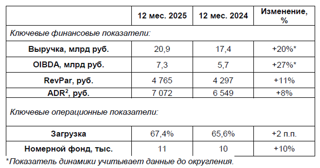 - Выручка Группы выросла на 20% год к году до 20,9 млрд рублей за счет эффективного управления ценообразованием, увеличения номерного фонда на 10%, роста количества гостей, повышения загрузки отелей и усиления MICE-сегмента. Отдельным направлением роста стало развитие клиентских продуктов: программы лояльности, цифровых сервисов и специальных предложений для разных категорий гостей.