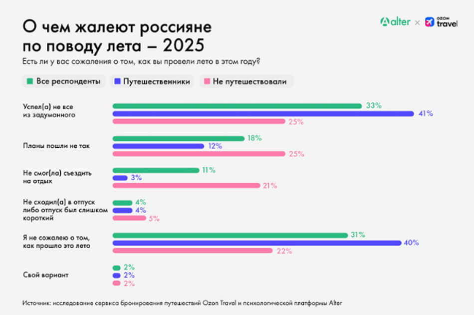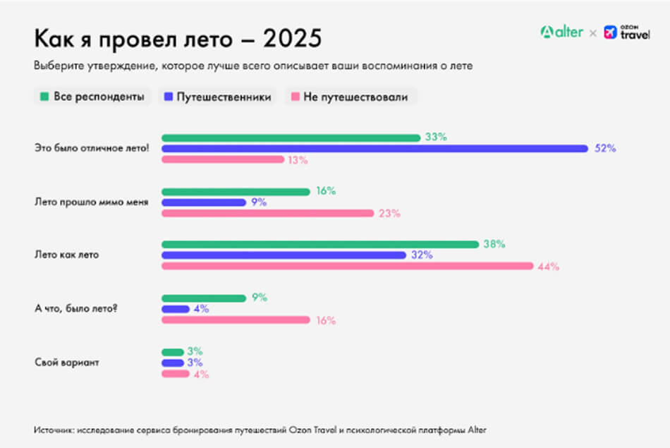 С наступлением холодов сервис бронирования путешествий Ozon Travel и психологическая платформа Alter провели ностальгический опрос о минувшем лете. В результате выяснилось, что 21% россиян полностью удовлетворены тем, как они провели теплый сезон. При этом те, кто путешествовал, больше довольны летним временем в этом году, чувствуют себя более отдохнувшими и успели реализовать больше планов.