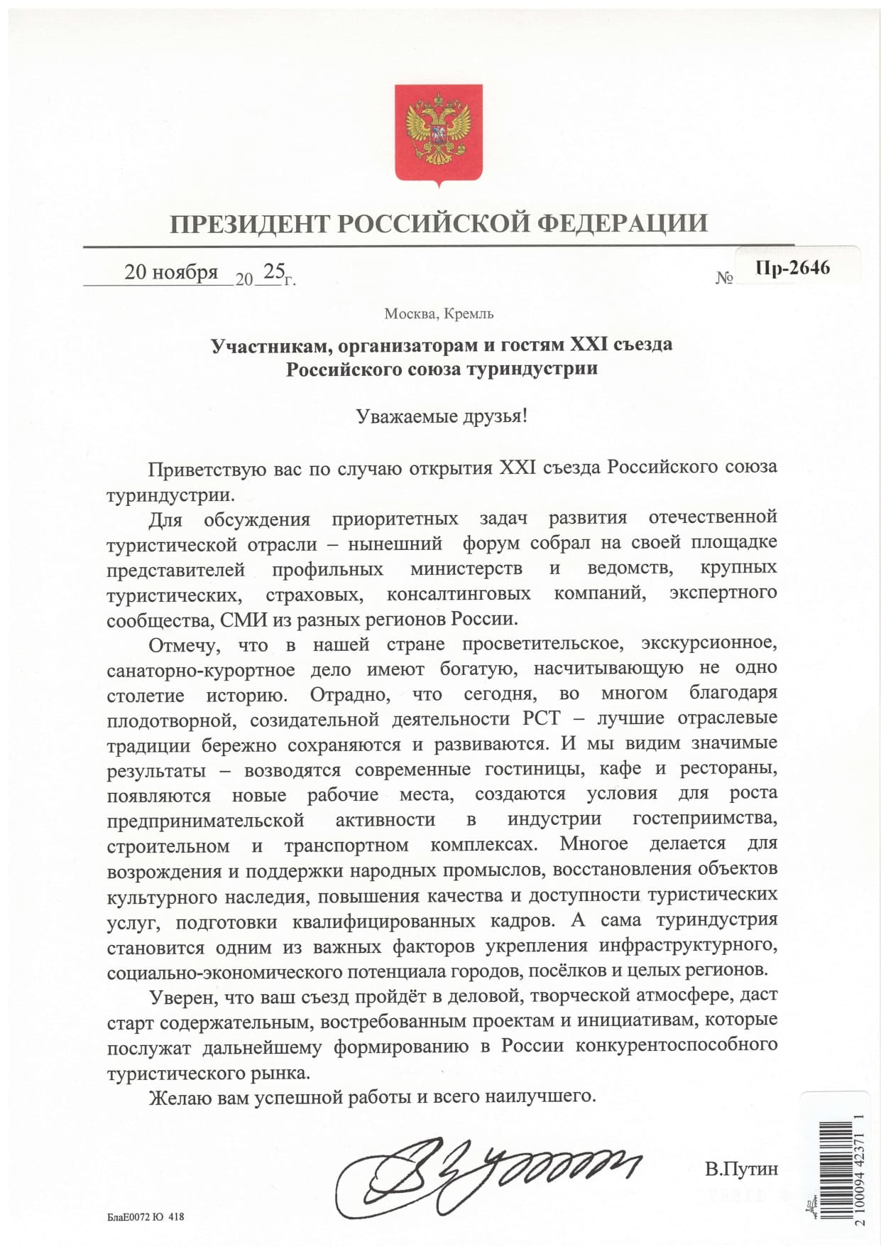 Владимир Путин выразил уверенность, что съезд пройдет в деловой, творческой атмосфере, даст старт содержательным, востребованным проектам и инициативам, которые послужат дальнейшему формированию в России конкурентоспособного туристического рынка.